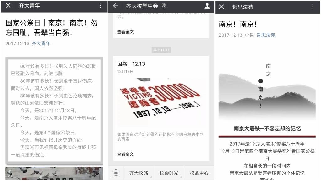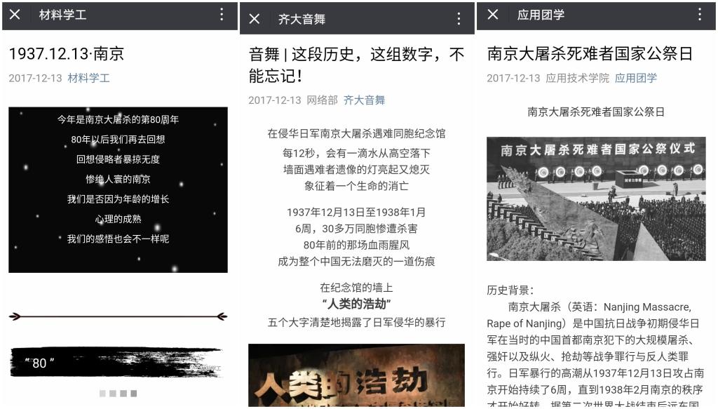 线上,我校各级团学组织通过微博、微信公众平台等网络新媒体开展纪念活动,推送国家公祭日主题文章15篇,广大团员青年纷纷以新媒体平台留言寄语的方式寄托对南京大屠杀遇难同胞的哀思。
